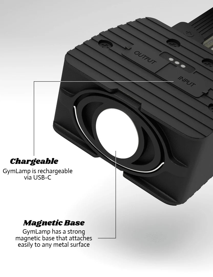 The Gym lamp comes with a strong magnetic clip that canbe easily attached to gym machines, metal surfaces, orother stable fixtures for hands-free lighting.